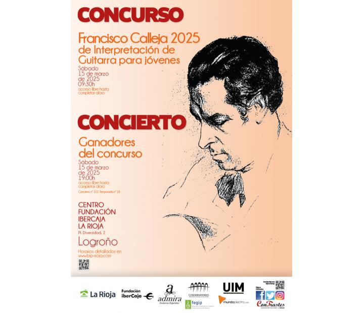 Francisco Calleja (1891-1950) fue un músico riojano que desarrolló una gran carrera internacional como guitarrista que merece ser reconocida y recordada. Desde muy joven actuó en múltiples escenarios, mostrando una clara proyección profesional. Por ello, dentro de las actividades organizadas por ConTrastes-Rioja, se convoca el Concurso de Interpretación de Guitarra para jóvenes “Francisco Calleja 2025”.