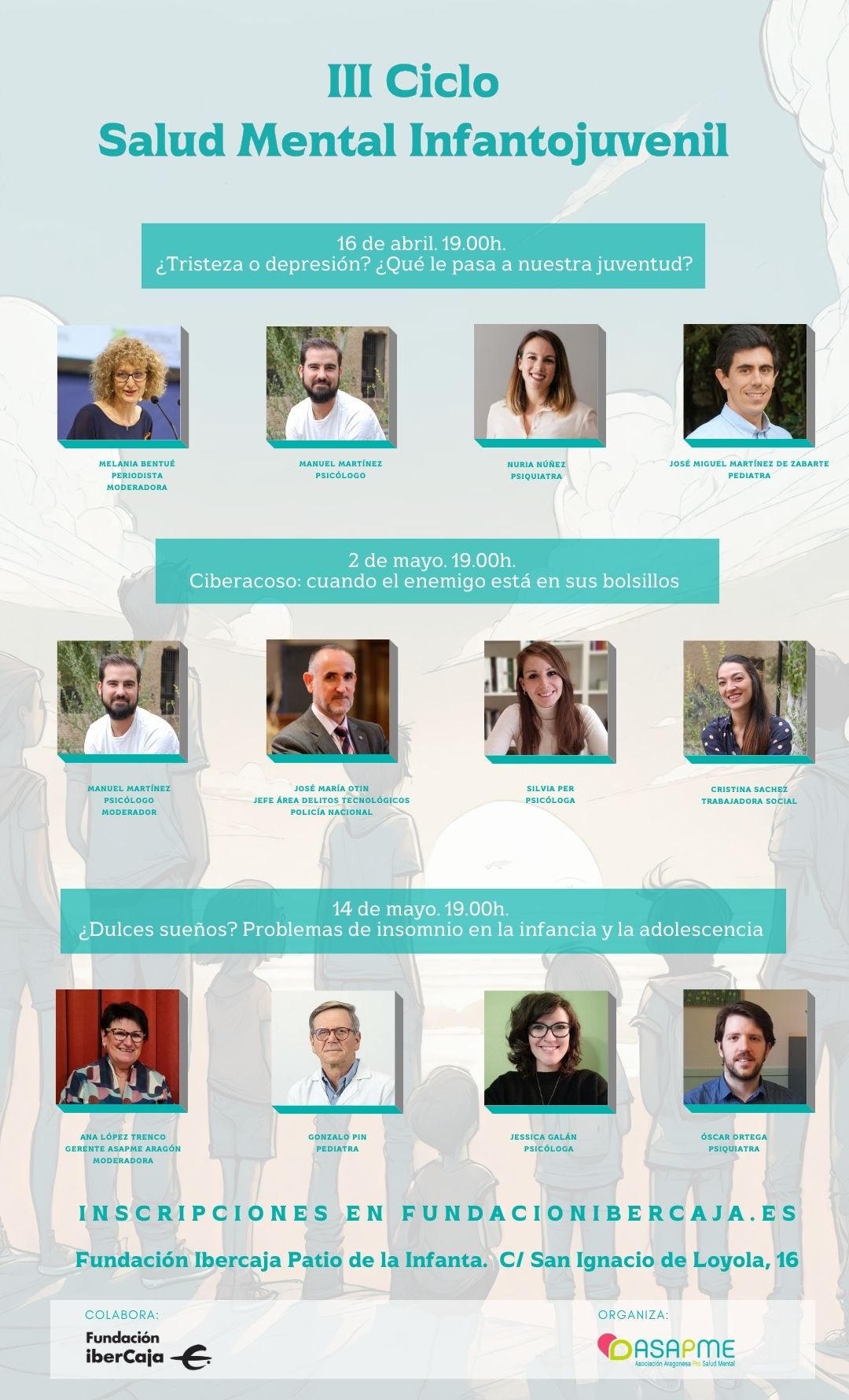 Fundación Ibercaja junto con la Asociación Aragonesa Pro Salud Mental (ASAPME), organizan la tercera edición del ciclo: Salud Mental Infantojuvenil, con el que buscan dar respuesta a algunos de los asuntos que más preocupan a jóvenes y familias relacionados con la salud mental. Además de la mesa redonda de hoy, el ciclo se completa con los títulos: Ciberacoso: cuando el enemigo está en sus bolsillos, el 2 de mayo; y ¿Dulces sueños? Problemas de sueño en la infancia y la adolescencia, el 14 de mayo.