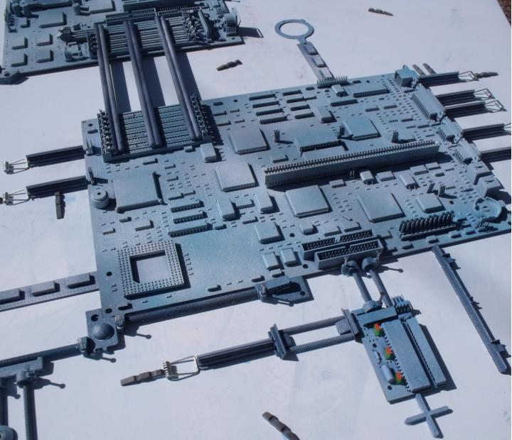 La “Plástica Estructural“ incorpora piezas de origen tecnológico e industrial, germen de los actuales Mundos Desconocidos (MD). Las piezas son elegidas condicionadas por su capacidad para encajar en los fondos pictóricos que las acogen.