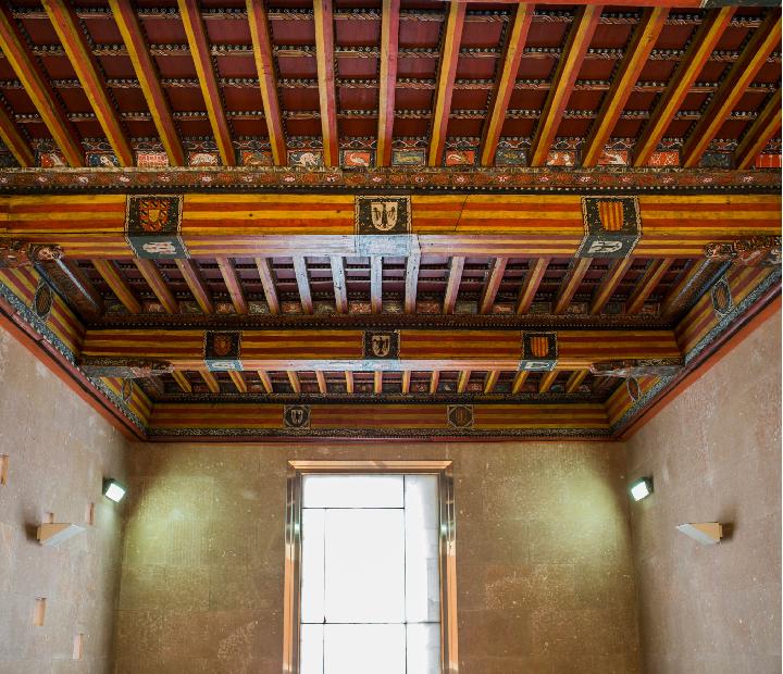En el Alfarje aparecen cuatro escudos correspondientes a dos matrimonios, el del rey Pedro III de Aragón y Constanza de Sicilia y el de los dueños de la casa, Blasco Pérez de Azlor y Sancha Tovía.