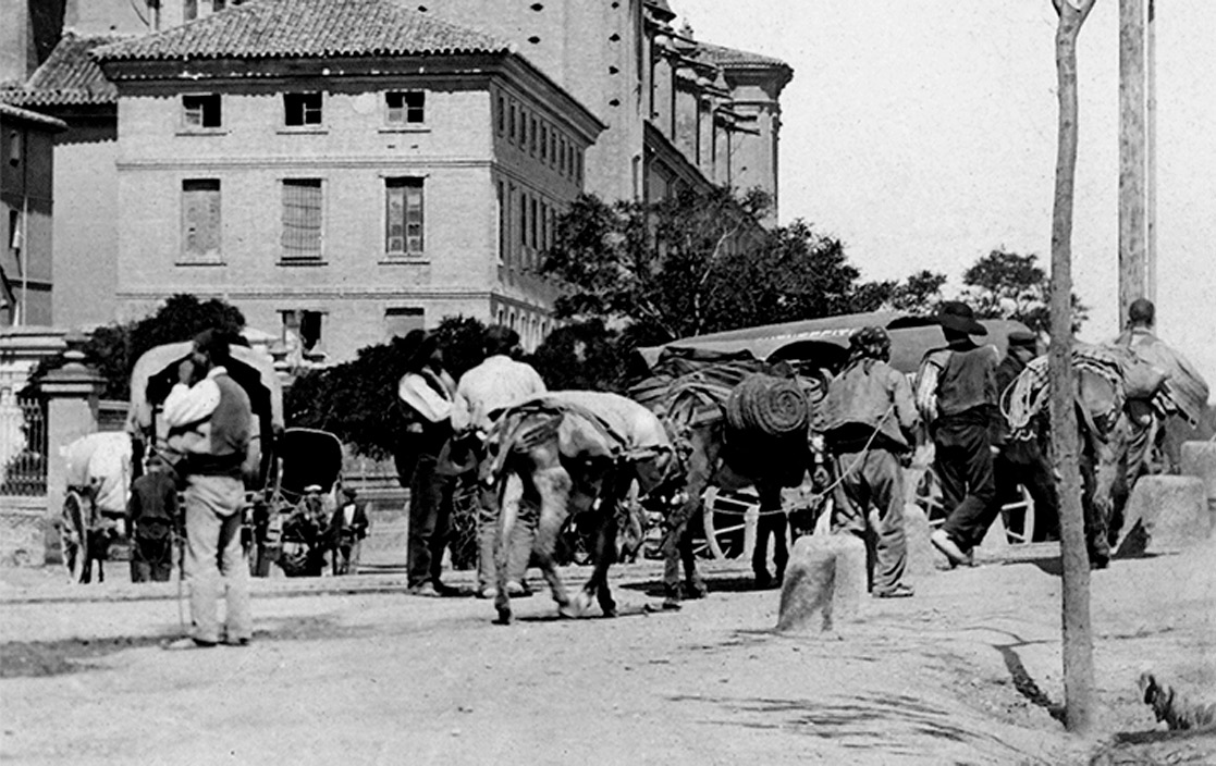 La escena se desarrolla en el entorno de una de las cuatro puertas de la antigua Zaragoza romana, la orientada al norte. Hasta 1868, fecha de su desaparición, se la conocería con varios nombres, siendo “la del Ángel (custodio de la ciudad)” el último de ellos. De haber podido captarla el fotógrafo, veríamos sus tres vanos (el central, más amplio, para el paso de los carruajes y las mercancías y los laterales para las personas) justo a la izquierda de la imagen, entre los edificios del seminario conciliar de la ciudad (hoy “casa de la Iglesia” y sede de Cáritas Diocesana) y las “Casas del Puente”, en la actual desembocadura de la calle de Don Jaime I en el paseo de Echegaray y Caballero.