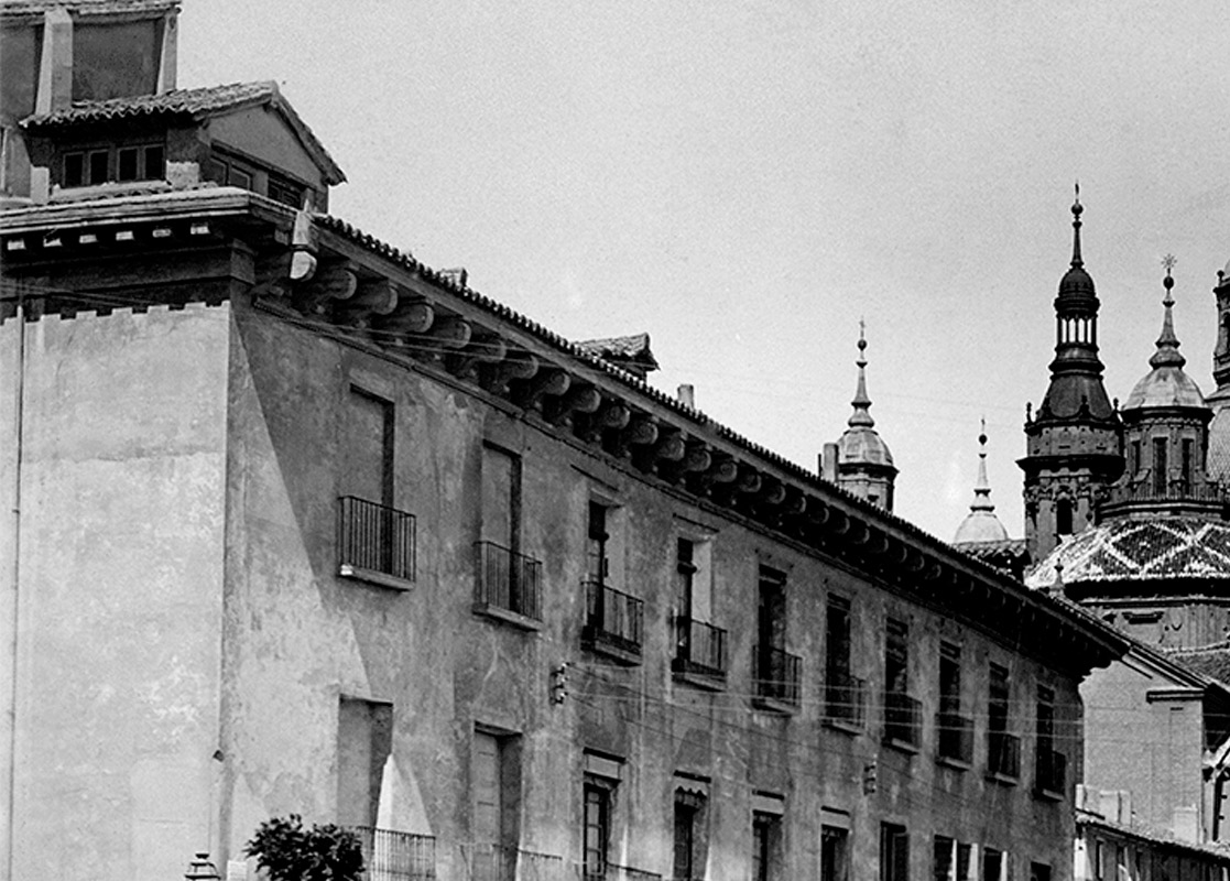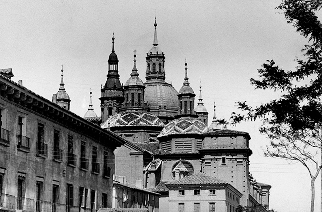 Al fondo, la inconfundible silueta de un templo de Nuestra Señora del Pilar que por aquel entonces contaba con tan solo una torre, la suroccidental o “de Santiago”, culminada pocos años antes, en 1892, con la colocación de un chapitel de cobre de cuarenta toneladas de peso fundido en la factoría “Averly”; y el “Colegio de Infantes”, la sede de la popular escolanía infantil de la catedral.