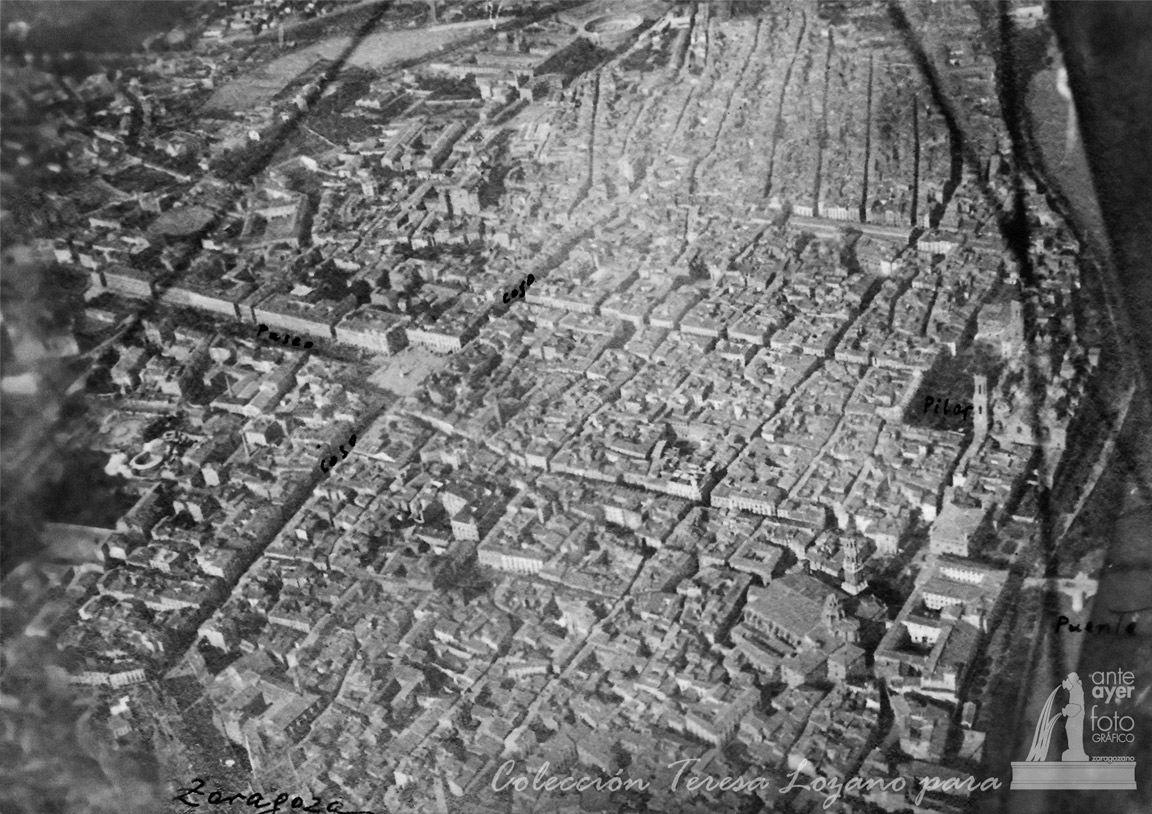 Inédita fotografía aérea de la ciudad de Zaragoza, tomada desde el Maurice Farman pilotado por el capitán Emilio Pardo Salinas. Colección Teresa Lozano, hacia 1919.