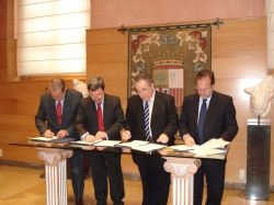 Zaragoza, 12 de marzo de 2007.- El Plan de Infraestructuras para la Atención de Disminuidos Psíquicos recibe un nuevo impulso. El consejero de Servicios Sociales y Familia, Miguel Ferrer, ha firmado hoy el Protocolo de colaboración para la financiación del Plan de Infraestructuras para la atención a Disminuidos Psíquicos en Aragón 2007, en el que se invertirán 4.181.263 euros durante este año. El protocolo también lo han suscrito el presidente de la Federación Aragonesa de Personas con Disminución Psíquica (FEAPS), José María López, el director de la Obra Social y Cultural de Ibercaja, Román Alcalá, y el director de la Obra Social y Cultural de Caja Inmaculada, Pedro Camarero.