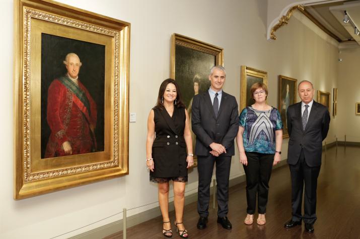 El cuadro, que marca el prototipo que sirvió de modelo para otras versiones posteriores de retratos del rey borbón, ha sido presentado esta mañana por Juan Carlos Sánchez, jefe de la Obra Social, de la Fundación Ibercaja; Magdalena Lasala, responsable del Programa de Educación y Cultura de la Obra Social de Ibercaja, y Rosario Añaños, directora del Museo Goya.