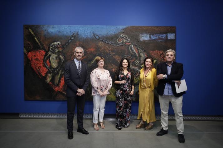 “Víctor Mira. En torno a Goya, el quinto perro y los disparates”, ha sido presentada esta mañana por Juan Carlos Sánchez, director de la Obra Social de Fundación Ibercaja; Magdalena Lasala, coordinadora general de la exposición y jefe del Programa de Educación y Cultura de la Obra Social de Fundación Ibercaja; Pepe Navarro, director del legado Víctor Mira; Lola Durán, comisaria de la exposición, y Rosario Añaños, directora del Museo Goya.