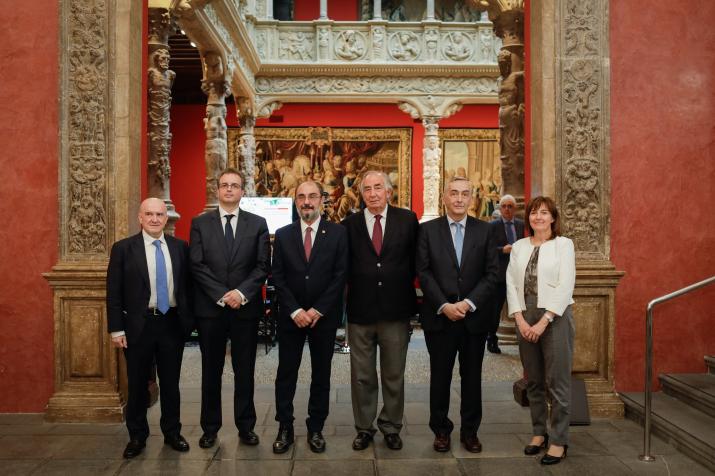El Patio de la Infanta ha acogido esta tarde la presentación del número 171 de la revista Papeles de Economía Española Eduardo Bandrés, director de la revista Papeles de Economía Española; Francisco Serrano, presidente de Ibercaja Banco; Javier Lambán, presidente del Gobierno de Aragón; Amado Franco, presidente de Fundación Ibercaja; Carlos Ocaña, director general de Funcas, y María José Moral, coordinadora del último número de la revista.