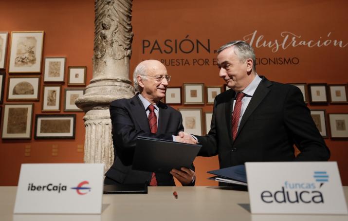 Zaragoza, 14 de marzo de 2018.- El presidente de Ibercaja, José Luis Aguirre, y el director general de la Fundación de las Cajas de Ahorro (Funcas), Carlos Ocaña, han firmado hoy el convenio por el que la entidad financiera se adhiere al “Programa Funcas de Estímulo de la Educación Financiera”. Con este acuerdo, ambas instituciones pretenden colaborar en la mejora del nivel y la calidad de la educación financiera de los ciudadanos mediante la consolidación de proyectos existentes y el desarrollo de otros nuevos.
