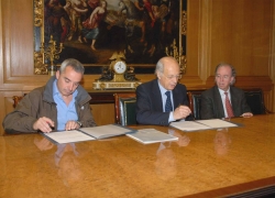 FIRMA DE CONVENIO DE IBERCAJA CON LA FUNDACIÓN PARA LA CONSERVACIÓN DEL QUEBRANTAHUESOS De izquierda a derecha, Juan Antonio Gil, vicepresidente de la fundación para la conservación del quebrantahuesos; José Luis Aguirre, director general de Ibercaja y José Manuel Etayo, responsable de estudios técnicos de la Obra Social y Cultural de Iberca